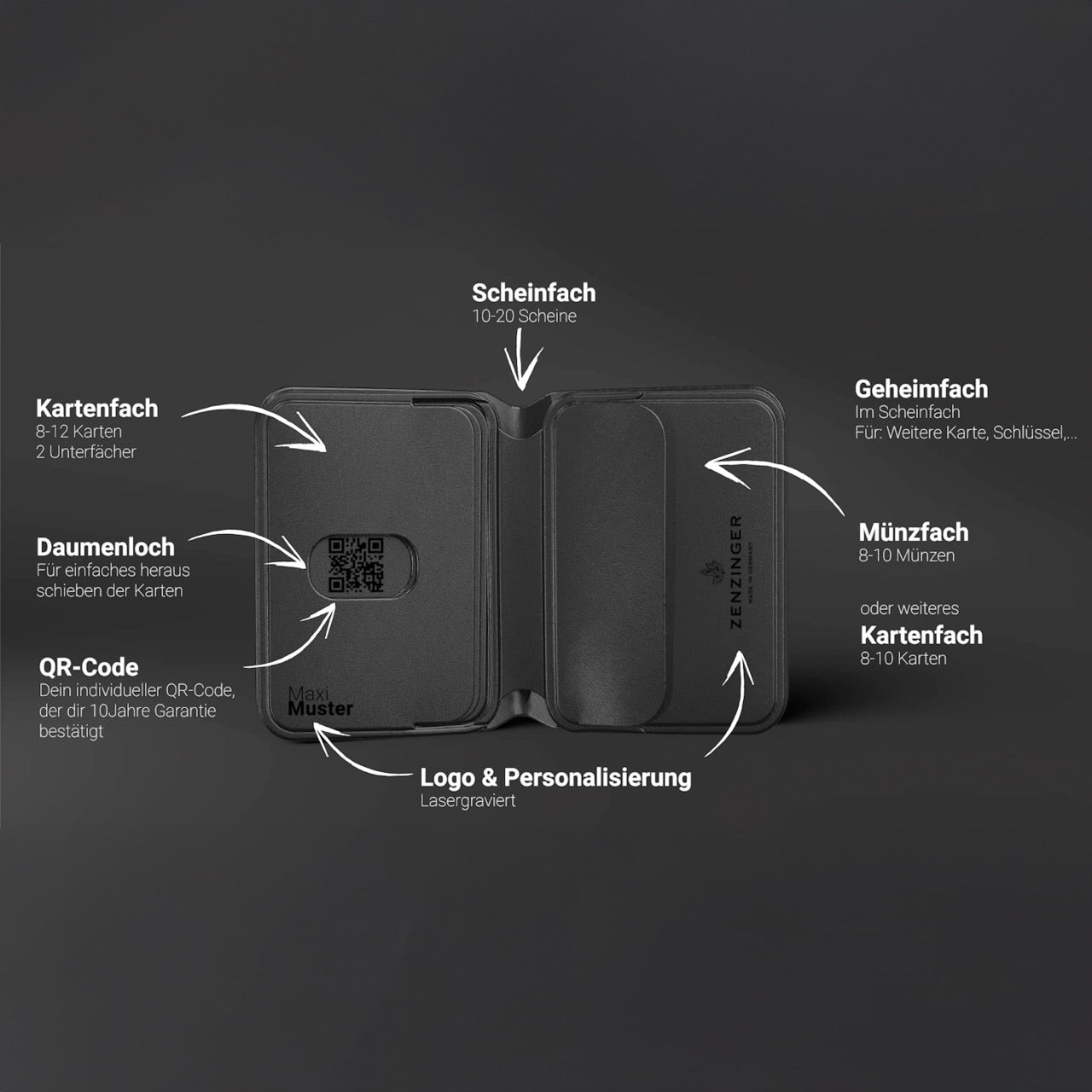 - Kleingeldfach für Münzen (oder 3 weitere Karten)